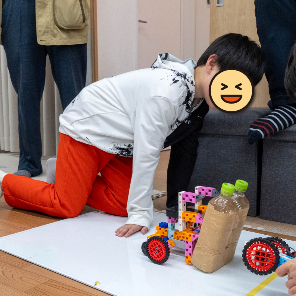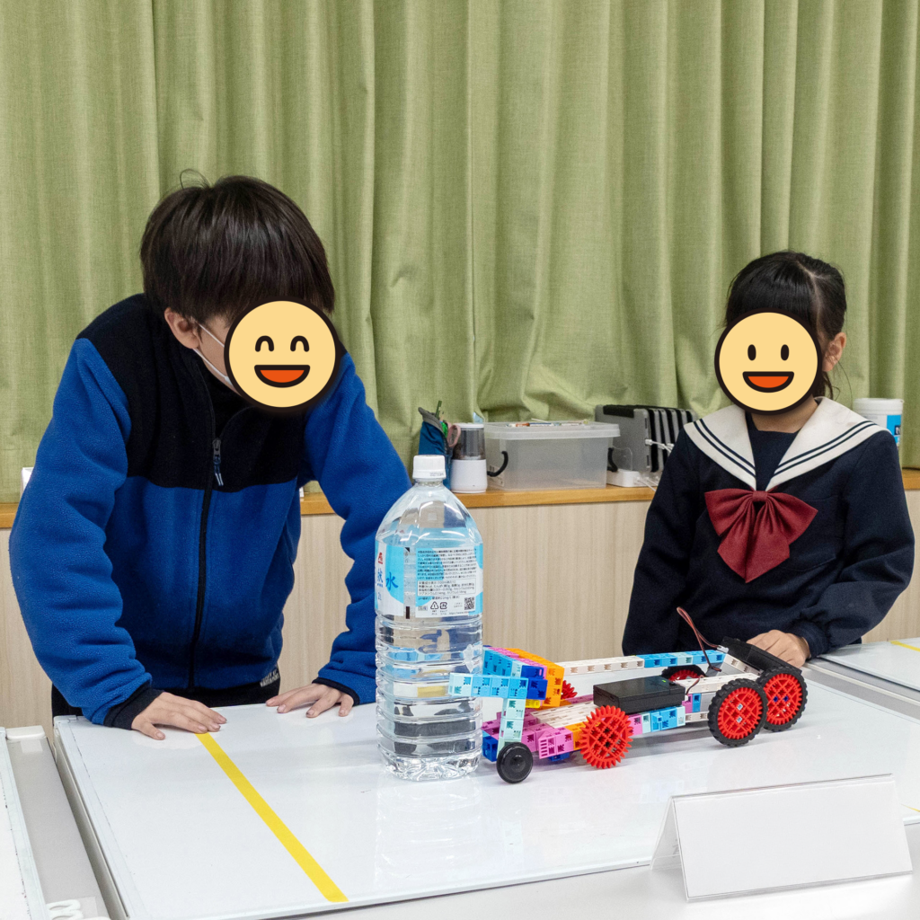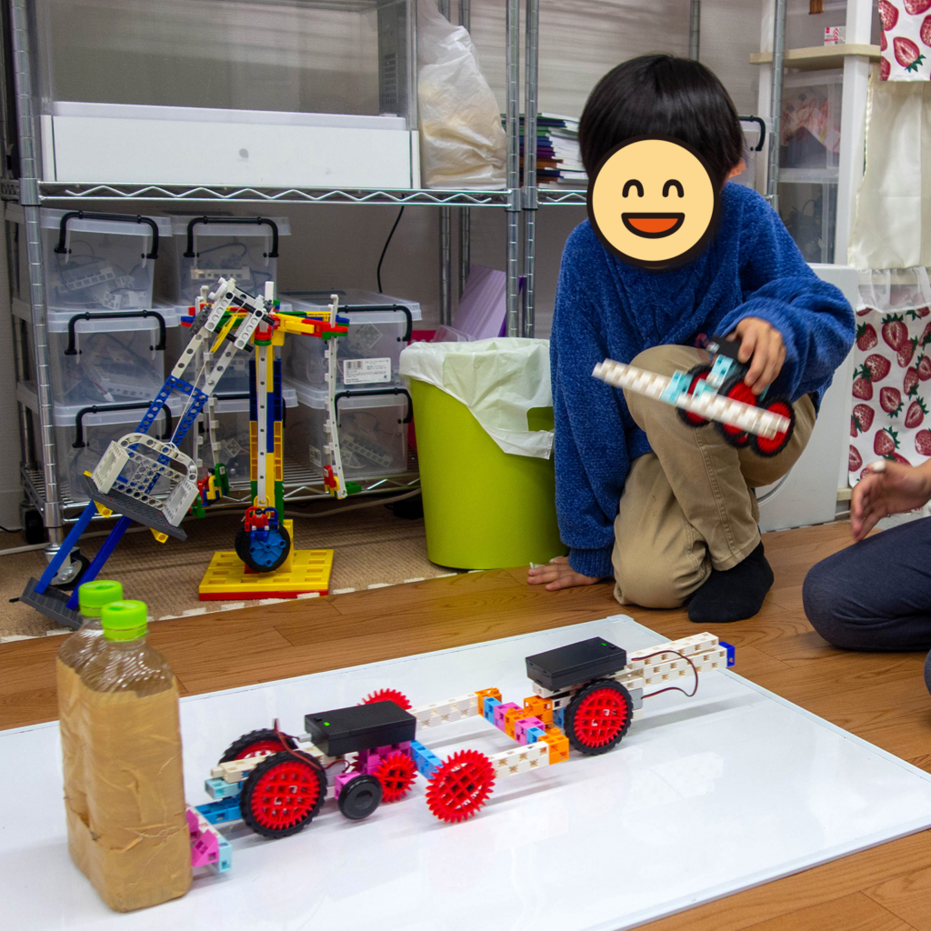 今回のレッスンのテーマは「チームワーク」でした。ペットボトルを押したり倒したりするロボット制作に挑戦。一見簡単そうに見えて、思うようには動きません。