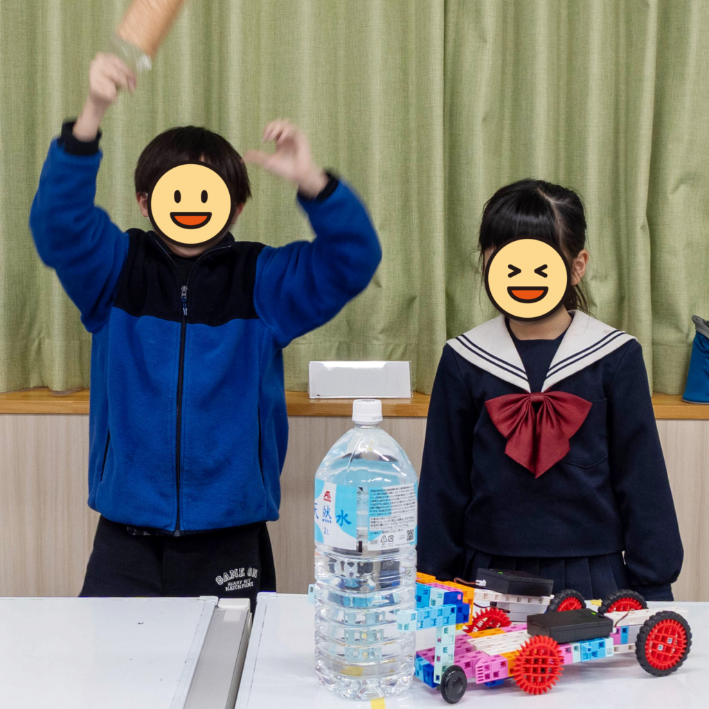 大きなペットボトルには仲間と挑戦。力を合わせることで、ついに動いた瞬間—教室には大きな達成感が広がりました。
