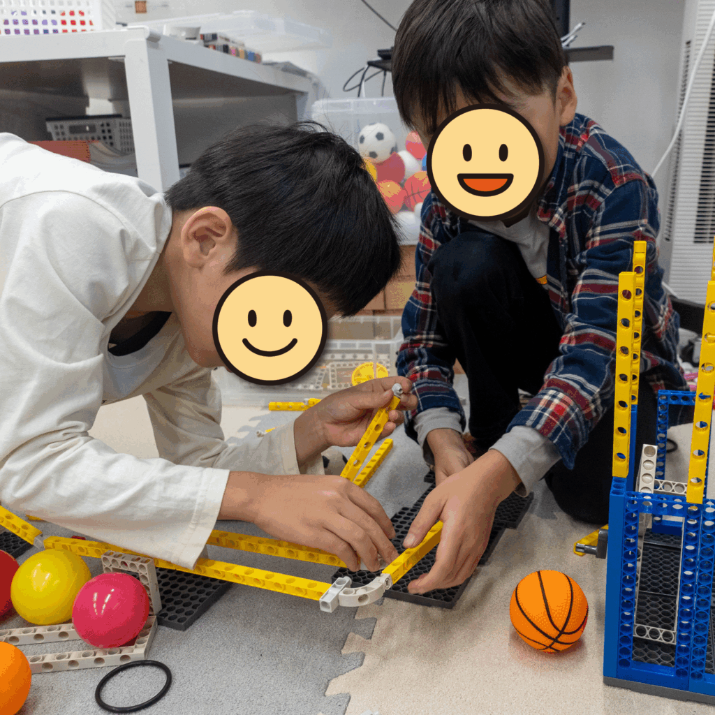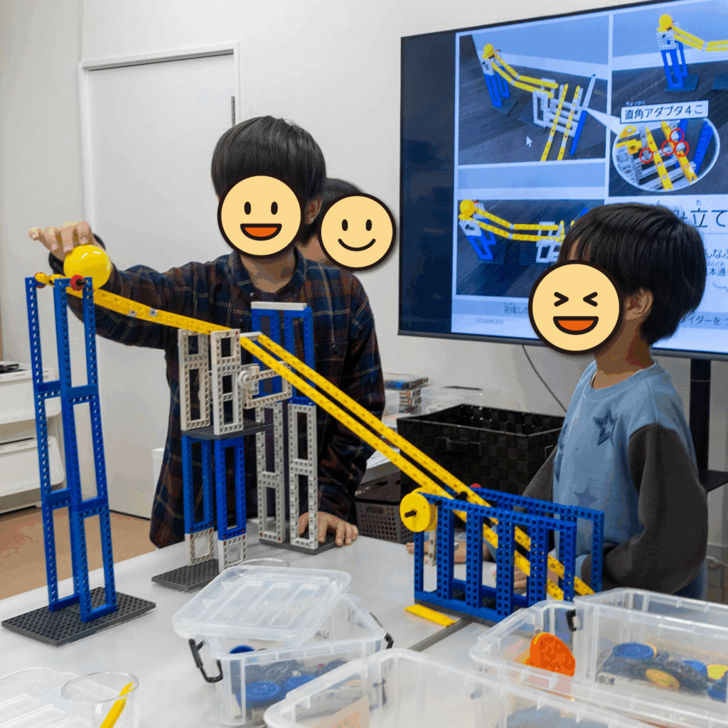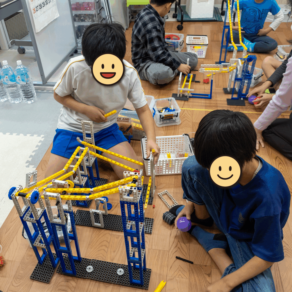 いつもは一人ひとりが自分だけの装置づくりに取り組んでいますが、今回はチームで協力して「斜面」を組み合わせた「直角安全スライダー」を制作しました。
